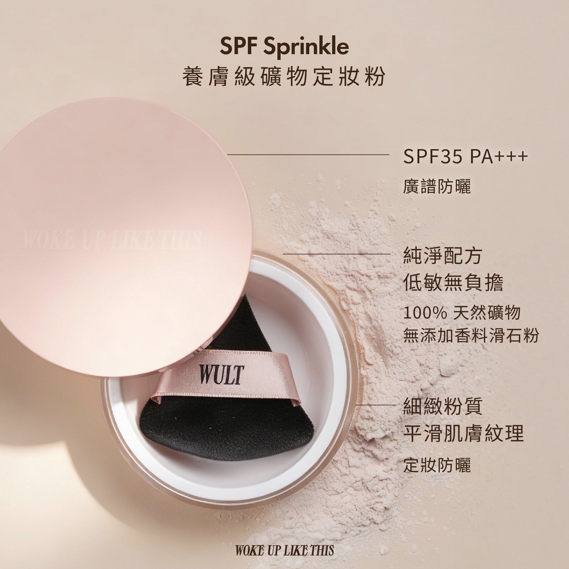 產品含有的氧化鋅和二氧化鈦為SPF35,建議先塗上日常物理性防曬液,再塗上礦物防曬粉作定妝或補搽防曬之用。